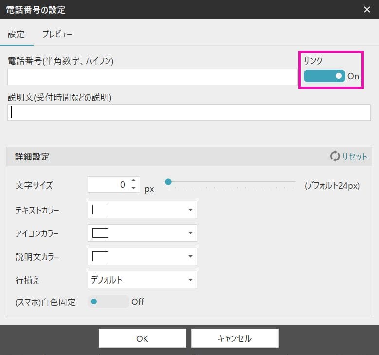 電話番号設定でリンクをONにすることで、CSSをカスタマイズしなくても携帯端末で発信画面に移動させることができます。この機能がないとHTMLとCSSを編集する必要がありますがシリウス2電話3クリックで可能です。